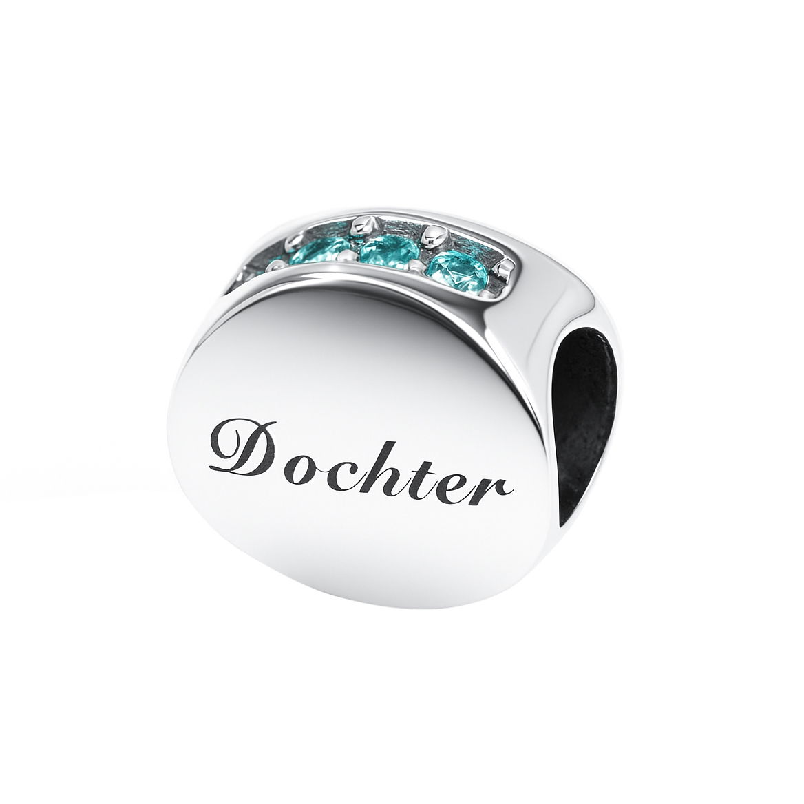 Maak je eigen bedelarmband helemaal compleet met deze prachtige ode aan je dochter. Een ronde bead met het woord DOCHTER op met blauwe zirkonia steentjes. Zo draag je je dochter altijd met je mee.